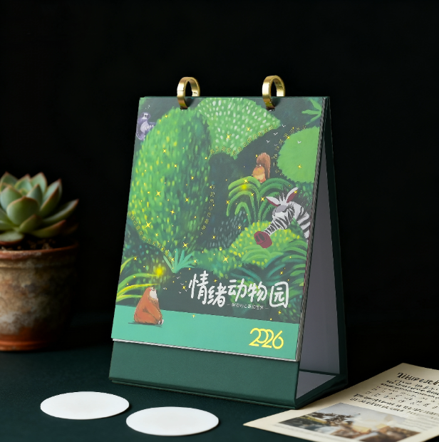指环扣设计:通常采用金属或塑料材质的环形结构,用于固定台历的页面,使其可以轻松翻页,同时也增加了台历的稳定性,不易倾倒。部分指环扣台历的指环还具有可拆卸性,方便更换页面或进行个性化定制。